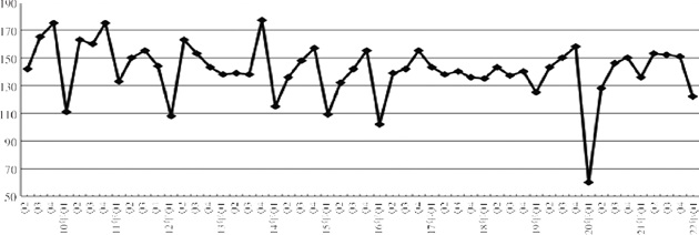 2022年四季度,外贸出口景气指数为100,比上季度下降了5个百分点,与去年同期相比下降了3个百分点,位于"微景气区间"(见图35)。其中,有33%的调查企业国外订单有了新的增长,比上季度上升了7个百分点;有34%的企业反映销售"持平",比上季度下降了19个百分点;有33%的企业反映"下降",比上季度上升了12个百分点。