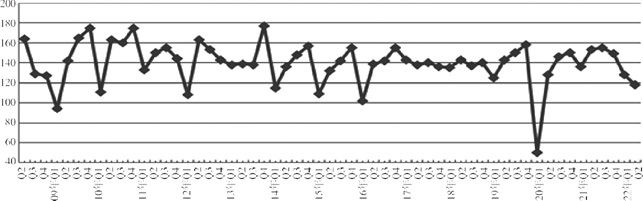 2022年一季度,外贸出口景气指数为100,比上季度下降了3个百分点,与去年同期持平,位于"微景气区间"(见图7)。其中,有27%的调查企业国外订单有了新的增长,比上季度下降了2个百分点;有46%的企业反映销售"持平",比上季度上升了1个百分点;有27%的企业反映"下降",比上季度上升了1个百分点。